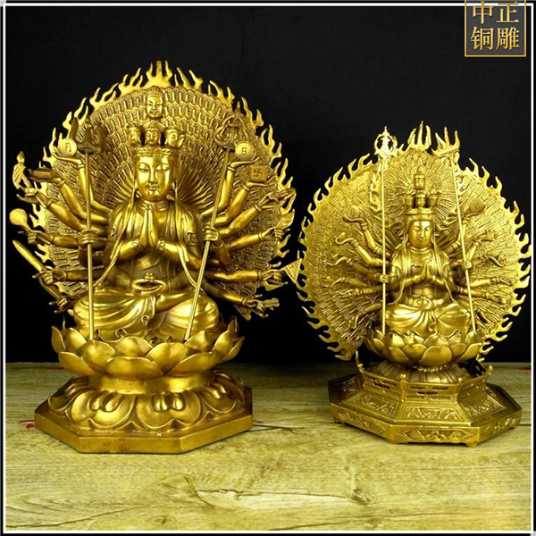 觀音的化身有很多,而千手觀音就是其中之一,而且還受到人們的虔誠供奉,但不知道大家是否了解千手觀音的來歷呢,“千”為無量及圓滿之義,以“千手”表示大慈悲的無量廣大,以“千眼”代表智慧的圓滿無礙。千手千眼觀世音能利益安樂一切眾生,隨眾生之機。中正銅雕-純銅千手觀音像、純銅千手觀音像價格、純銅千手觀音像廠家,我司是一家資質齊全、設備完整、實力雄厚的私營企業,集科研、開發設計、普通鑄造、一次性整體澆鑄、精密鑄造于一體。主要鑄造大型現代人物銅雕,抽象人物銅雕,抽象人物銅雕,歷史人物銅雕,動物銅雕,園林景觀銅雕等。