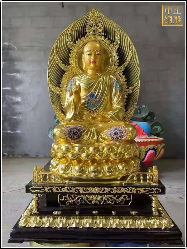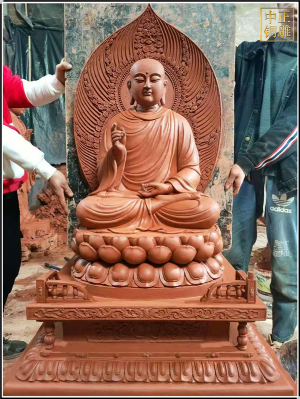 這件1.6米高的地藏王銅像,現已完成發貨安裝,從泥塑制作到上色歷時兩個月的時間,據《地藏菩薩本愿經》載:其為釋迦既滅后,彌勒未生前,眾生賴以救苦,自誓必盡度六道眾生,始愿成佛的菩薩。相傳其顯靈說法的道場在安徽九華山。作為胎藏界地藏院的菩薩,形象為身披袈裟,掛瓔珞、戴寶冠,手持寶珠及錫杖,呈菩薩或沙門狀。九華山月身寶殿內設七級木質寶塔,每層佛龕八座,供奉地藏全身從像。大足177號地藏變相窟塑地藏菩薩中坐,左右各二化身像,造型古樸渾厚,線條洗練,突出了憨厚慈悲的性格特征。敦煌莫高窟五代、宋代窟的甬道頂部均繪有地藏像,體態豐滿,衣飾華麗,色彩濃艷,形式多變。唐縣中正銅雕工藝品廠是鑄銅雕塑的廠家。擁有設計師和雕塑團隊,引進的鑄造技術,開發出一系列的銅制工藝品。